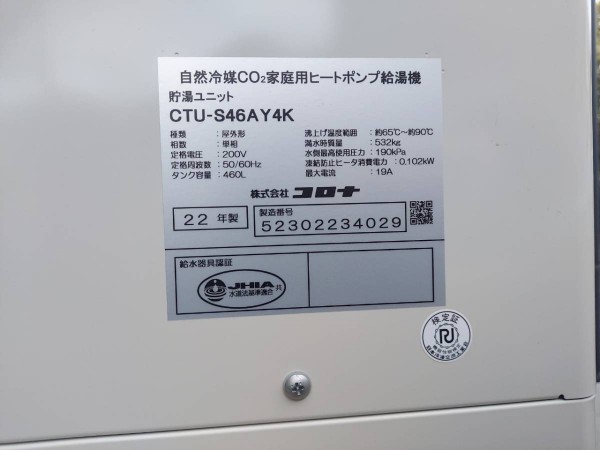 高知市薊野 コロナ自然冷媒CO2家庭用ヒートポンプ給湯機 貯湯ユニットCTU-S46AY4K エコキュート交換工事|高知県のエコキュート専門交換工事店|高知エコキュート交換ショップ補助金対応可能
