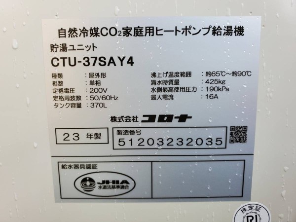 香美市土佐山田町平山 コロナ自然冷媒CO2家庭用ヒートポンプ給湯機 貯湯ユニットCTU-37SAY4、ヒートポンプユニットCHP-YA453 エコキュート交換工事|高知県のエコキュート専門交換工事店|高知エコキュート交換ショップ補助金対応可能