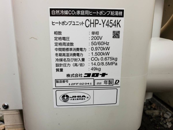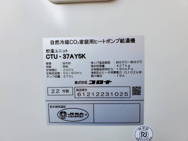 香美市物部町柳瀬 コロナ自然冷媒CO2家庭用ヒートポンプ給湯機 貯湯ユニットCTU-37AY5K、ヒートポンプユニットCHP-Y454K エコキュート交換工事|高知県のエコキュート専門交換工事店|高知エコキュート交換ショップ補助金対応可能
