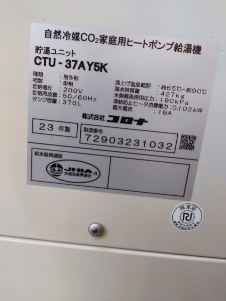 室戸市浮津 コロナ自然冷媒CO2家庭用ヒートポンプ給湯機貯湯ユニットCTU-37AY5K、ヒートポンプユニットCHP-Y454K エコキュート交換工事