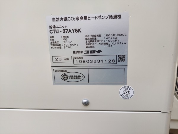 南国市下島 コロナ自然冷媒CO2家庭用ヒートポンプ給湯機貯湯ユニットCTU-37AY5K エコキュート交換工事