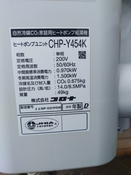 高知市赤石町 コロナ自然冷媒CO2家庭用ヒートポンプ給湯機ヒートポンプユニットCHP-Y454K エコキュート交換工事|高知県のエコキュート専門交換工事店|高知エコキュート交換ショップ補助金対応可能
