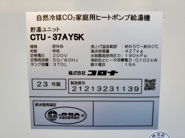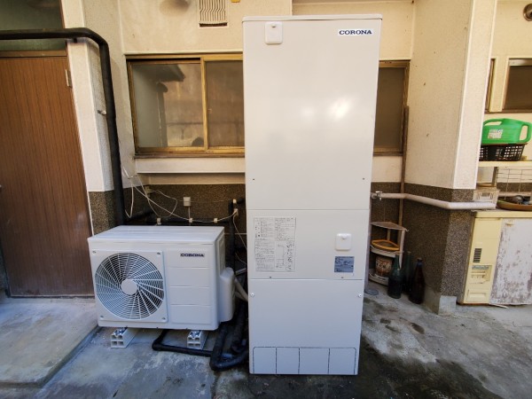 香美市土佐山田町平山 コロナ自然冷媒CO2家庭用ヒートポンプ給湯機ヒートポンプユニットCHP-Y454K、貯湯ユニットCTU-37AY5K エコキュート交換工事