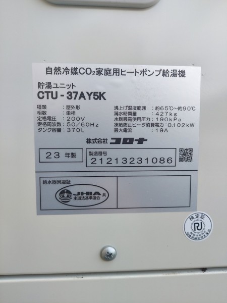 高知市薊野 東芝エコキュート→コロナ自然冷媒CO2家庭用ヒートポンプ給湯機ヒートポンプユニットCHP-Y454K、貯湯ユニットCTU-37AY5K エコキュート交換工事