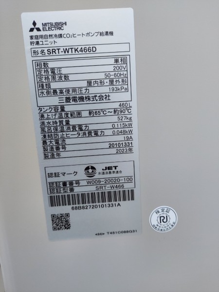 須崎市泉町 三菱電機自然冷媒CO2家庭用ヒートポンプ給湯機貯湯ユニットSRT-WTK466D、ヒートポンプユニット エコキュート交換工事