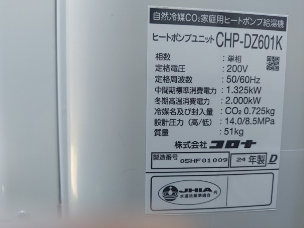 土佐市用石 コロナ自然冷媒CO2家庭用ヒートポンプ給湯機ヒートポンプユニットCHP-DZ601K エコキュート交換工事