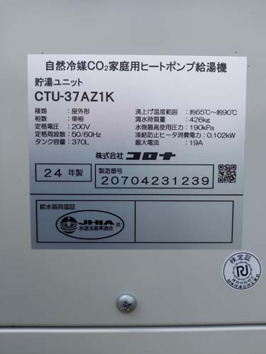高知市赤石町 コロナ自然冷媒CO2家庭用ヒートポンプ給湯機 貯湯ユニットCTU-37AZ1K、ヒートポンプユニットCHP-DZ451Kエコキュート交換工事