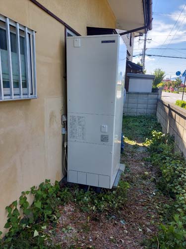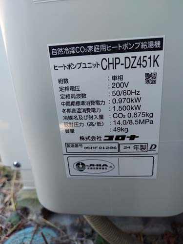 香美市物部町柳瀬 コロナ自然冷媒CO2家庭用ヒートポンプ給湯機ヒートポンプユニットCTU-37AZ1K、ヒートポンプユニットCHP-DZ451K エコキュート交換工事