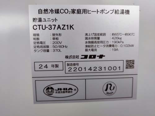 宿毛市樺 コロナ自然冷媒CO2家庭用ヒートポンプ給湯機貯湯ユニットCTU-37AZ1K、ヒートポンプユニットCHP-DZ451K エコキュート交換工事
