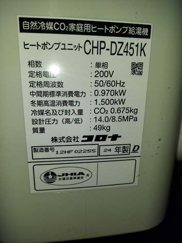 宿毛市樺 コロナ自然冷媒CO2家庭用ヒートポンプ給湯機 ヒートポンプユニットCHP-DZ451K エコキュート交換工事