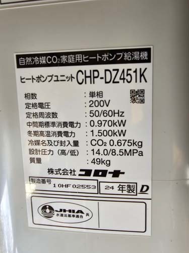 香南市野市町東野 コロナ自然冷媒CO2家庭用ヒートポンプ給湯機 ヒートポンプユニットCHP-DZ451K エコキュート交換工事
