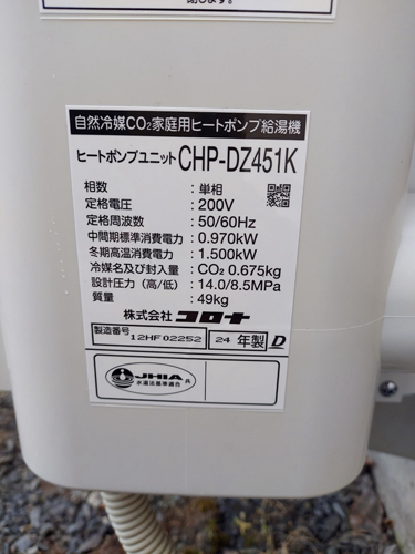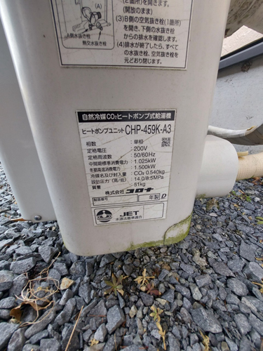 香美市物部町柳瀬 コロナ自然冷媒CO2家庭用ヒートポンプ給湯機 ヒートポンプユニットCHP-DZ451K エコキュート交換工事|高知県のエコキュート専門交換工事店|高知エコキュート交換ショップ補助金対応可能
