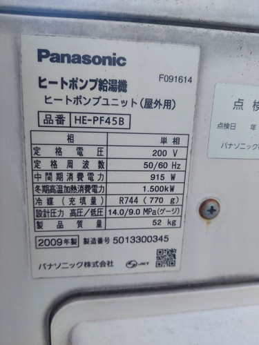 高知市薊野 パナソニックヒートポンプ給湯機 ヒートポンプユニットHE-PF45B→コロナ自然冷媒CO2家庭用ヒートポンプ給湯機 ヒートポンプユニットCHP-DZ451K エコキュート交換工事