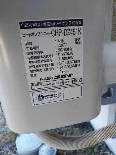 高知市薊野 コロナ自然冷媒CO2家庭用ヒートポンプ給湯機 ヒートポンプユニットCHP-DZ451K エコキュート交換工事|高知県のエコキュート専門交換工事店|高知エコキュート交換ショップ補助金対応可能
