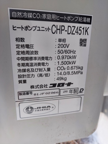 香美市土佐山田町平山 コロナ自然冷媒CO2家庭用ヒートポンプ給湯機 ヒートポンプユニットCHP-DZ451K エコキュート交換工事|高知県のエコキュート専門交換工事店|高知エコキュート交換ショップ補助金対応可能
