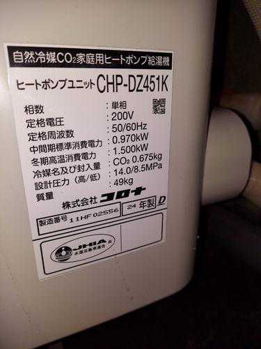 香美市物部町柳瀬 コロナ自然冷媒CO2家庭用ヒートポンプ給湯機 ヒートポンプユニットCHP-DZ451K エコキュート交換工事|高知県のエコキュート専門交換工事店|高知エコキュート交換ショップ補助金対応可能