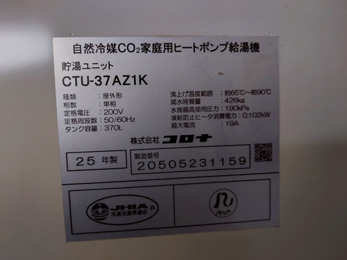 いの町枝川 コロナ自然冷媒CO2家庭用ヒートポンプ給湯機貯湯ユニットCTU-37AZ1K、ヒートポンプユニットCHP-DZ451K エコキュート交換工事