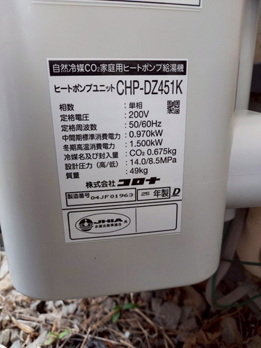 トップページ > 工事事例一覧 > いの町枝川 コロナ自然冷媒CO2家庭用ヒートポンプ給湯機貯湯ユニットCTU-37AZ1K、ヒートポンプユニットCHP-DZ451K エコキュート交換工事