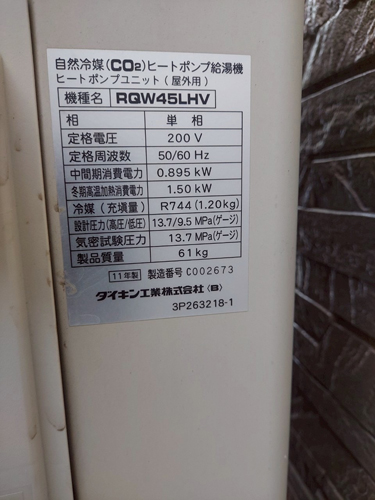 いの町槇 ダイキン自然冷媒CO2ヒートポンプ給湯機ヒートポンプユニットRQW45LHV→コロナ自然冷媒CO2家庭用ヒートポンプ給湯機貯湯ユニットCTU-37AZ1K、ヒートポンプユニットCHP-DZ451K エコキュート交換工事