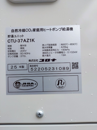 いの町槇 コロナ自然冷媒CO2家庭用ヒートポンプ給湯機貯湯ユニットCTU-37AZ1K、ヒートポンプユニットCHP-DZ451K エコキュート交換工事