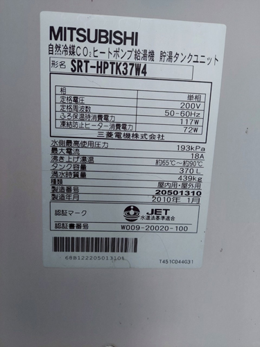 馬路村馬路 三菱電機自然冷媒CO2ヒートポンプ給湯機 貯湯タンクユニットSRT-HPTK37W4→コロナ自然冷媒CO2家庭用ヒートポンプ給湯機 ヒートポンプユニットCHP-DZ451K エコキュート交換工事