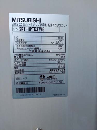 いの町加茂町 三菱電機自然冷媒CO2ヒートポンプ給湯機 貯湯タンクユニットSRT-HPTK37W5→パナソニック家庭用ヒートポンプ給湯機 ヒートポンプユニットHE-PLS45L エコキュート交換工事